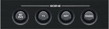 Pressing a SCENE button powers on the AV Receiver and selects the input source and DSP mode. You can re-set the buttons for different sources by selecting a source and DSP mode, then pressing a SCENE button for more than three seconds.