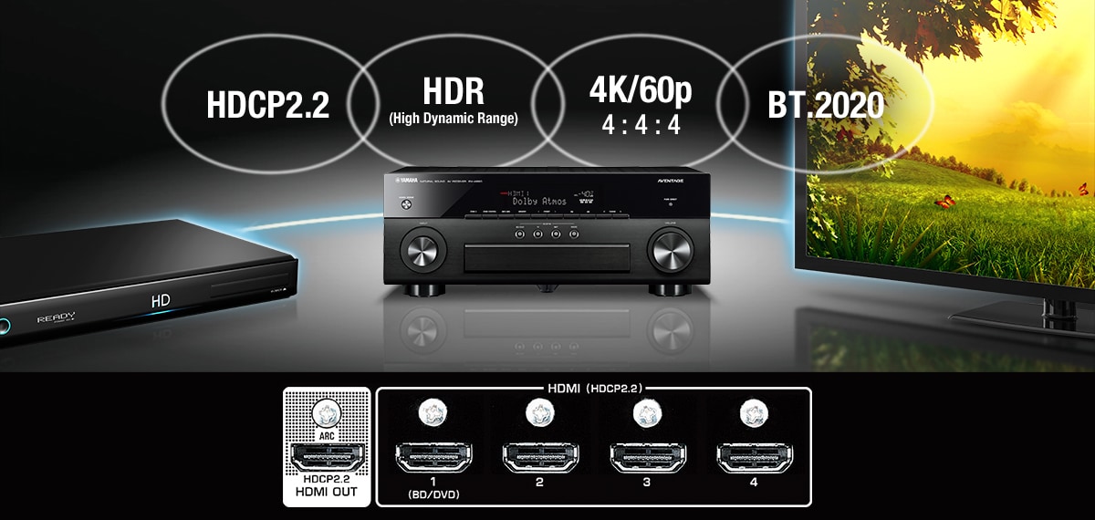 - HDMI® (4 in / 1 out) 4K Ultra HD Full Support with 4K60p (4:4:4), HDCP2.2 (4 in / 1 out), HDR Video and BT.2020 pass-through