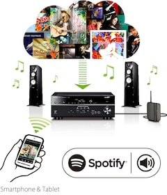 With the Spotify app on your smartphone, you've got instant access to millions of songs. And now you can stream those songs to your Yamaha system by using Spotify Connect. Just hit play to start streaming music. What's more, when you've been listening on your smartphone outside and come inside, the song immediately streams to your AVR—like magic, you enjoy uninterrupted music. You can also personalise playlists and receive phone calls while listening to music.