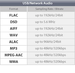 - DSD 2.8MHz / 5.6MHz, FLAC / WAV / AIFF 192kHz / 24bit, Apple Lossless 96kHz / 24-bit playback
