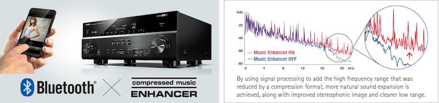 This AV receiver is equipped with Bluetooth functionality to let you enjoy easy wireless music playback from smartphones and other devices. Yamaha Compressed Music Enhancer is now optimised for Bluetooth audio transmission to ensure that your music will have vivid, lively sound quality even during wireless playback.