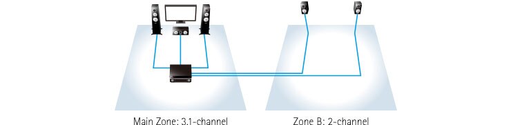 Zone B output provides 2-channel sound in a second room