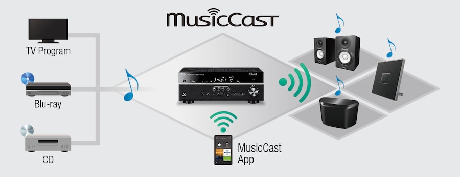 MusicCast employs a high performance wireless network to deliver music and audio enjoyment. It can stream digital music content from your smartphone, PC or NAS to other MusicCast devices in your home. It can also share the music from external devices such as a TV or Blu-ray Disc™ player connected to the RX-V781. Audio content from Bluetooth®-connected smartphones or tablets can also be streamed to MusicCast devices in multiple rooms.