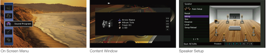 Yamaha’ s latest Graphical User Interface has a high resolution display for characters, icons and images, with clear, easy-to-use menus. It also includes a selectable Status Bar that shows input source, volume level, DSP mode and audio format. The GUI provides a choice of eight languages: English, French, German, Spanish, Italian, Russian, Japanese and Chinese, and can be displayed over both normal and 3D pictures.