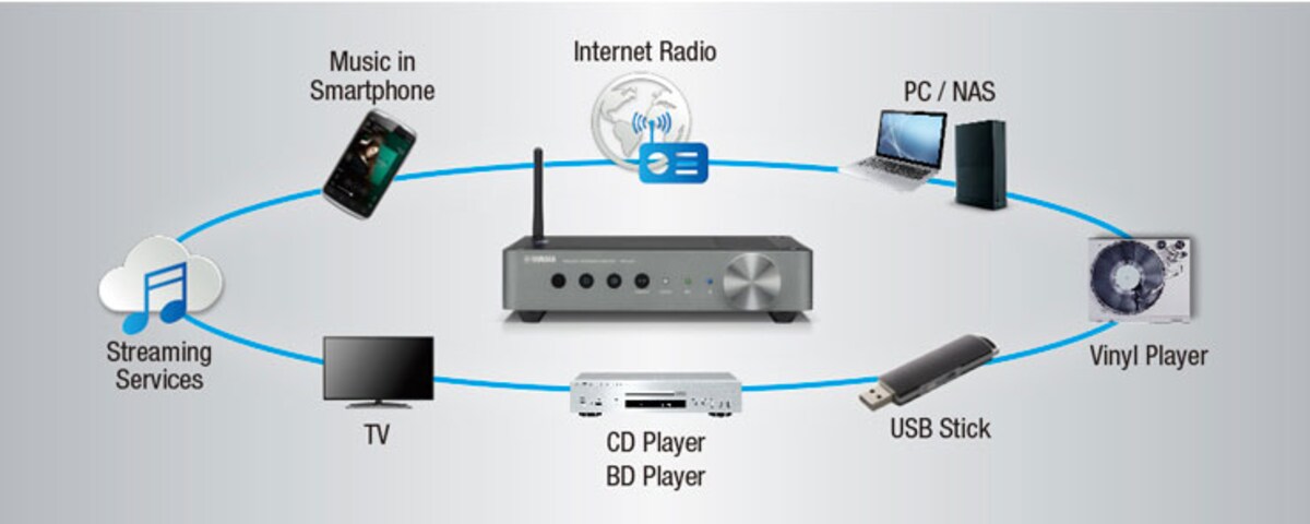 MusicCast employs a high performance wireless network to deliver music and audio enjoyment. It can stream digital music content from your smartphone, PC or NAS to other MusicCast devices in your home. It can also share the music from external devices such as a TV or Blu-ray Disc™ player connected to the WXA-50. Audio content from Bluetooth®-connected smartphones or tablets can also be streamed to MusicCast devices in multiple rooms.