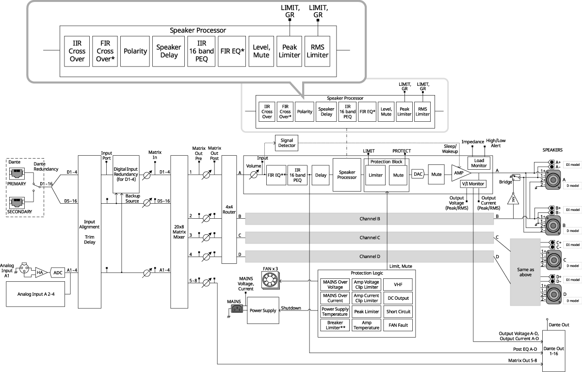 • Speaker processor such as 16 band PEQ, crossover, filters, delay and limiter