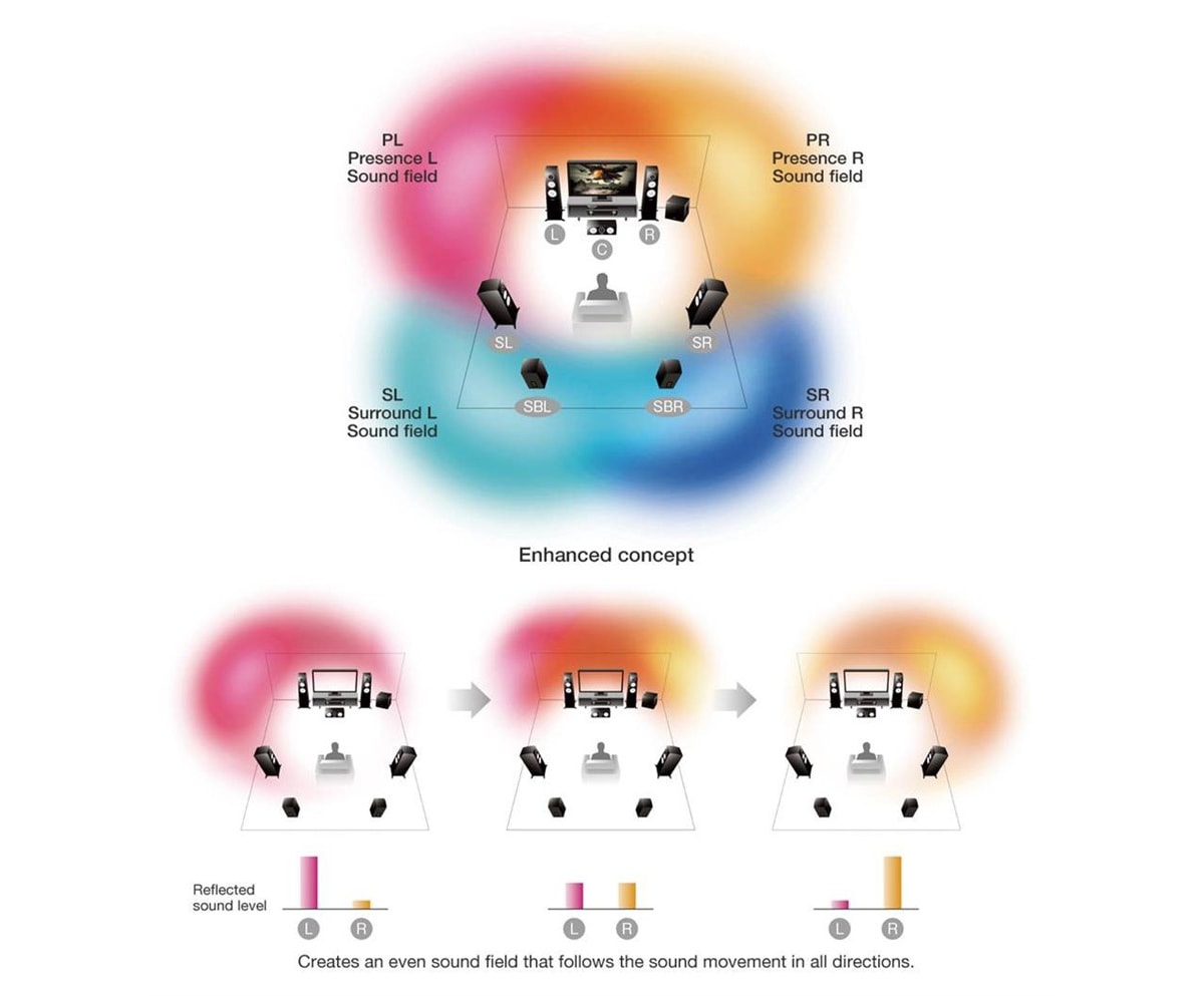 CINEMA DSP 3D provides a wide, high and dense sound field. HD Audio format decoding lets you enjoy HD Audio sources. Virtual Presence Speaker delivers 3-dimensional sound without actual use of presence speakers.