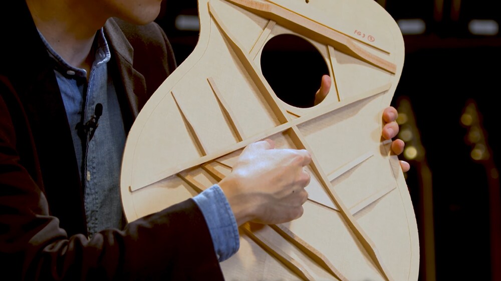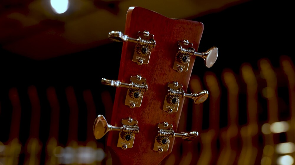 Ueda: I could hear people around me wondering why on earth we were making so many, but that’s what it was going to take if we wanted to make something good, so in the end we got permission. For the appearance, we had to come up with something original for Yamaha’s first folk guitar, so we made the head in the shape of a Y to stand for Yamaha. The pickguard is also something that indicates right away that it’s a Yamaha. We used to say that it had a “bump,” because of the part that sticks out beside the fingerboard above the sound hole.