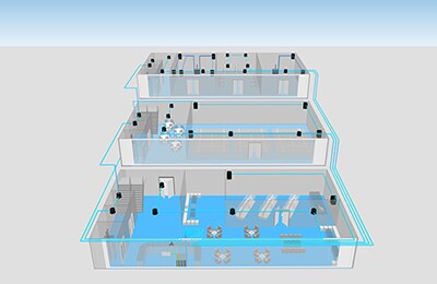 In addition to individual sound systems in each studio, this system provides the ability to broadcast announcements throughout the entire facility. The needs of smaller studios for yoga and similar lessons are covered by a compact system consisting of an MA2030 mixing amplifier connected directly to a pair of speakers. Larger dance studios add a subwoofer to the speaker system for extra musical depth and impact.