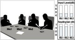 When nobody is speaking all input levels are low and the gain levels are equal. The microphones are not muted. The gain is equally distributed between them.