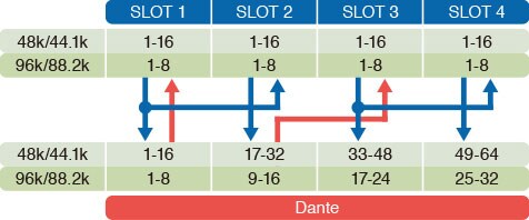 PATTERN 6: Dante inputs 1~16* to slots 1 and 2 / Dante inputs 17~32* to slots 3 and 4