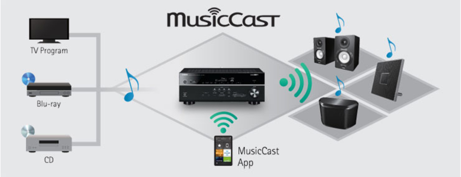 MusicCast employs a high performance wireless network to deliver music and audio enjoyment. It can stream digital music content from your smartphone, PC or NAS to other MusicCast devices in your home. It can also share the music from external devices such as a TV or Blu-ray Disc™ player connected to the RX-A1060. Audio content from Bluetooth®-connected smartphones or tablets can also be streamed to MusicCast devices in multiple rooms.