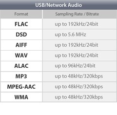 • DSD 2.8 MHz / 5.6 MHz, FLAC / WAV / AIFF 192 kHz / 24-bit, Apple® Lossless 96 kHz / 24-bit playback