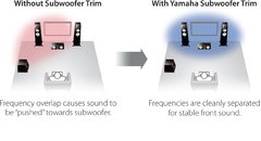 The Subwoofer Trim control enhances the low frequencies by avoiding overlap with the front speaker output. This will result in a cleaner, more focused sound stage while providing a seamless frequency response. When subwoofer frequency overlap occurs in conventional systems, the overall sound is “pushed” toward the subwoofer. Subwoofer Trim takes care of this by separating the low subwoofer frequencies cleanly, thus stabilising the front stage while providing a well-balanced enhanced bass sound.