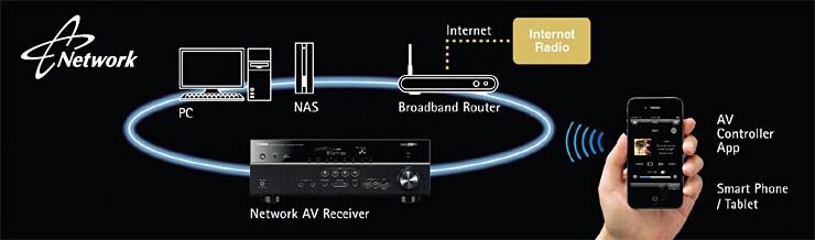 This AV receiver provides a variety of network functions that enable you to access more sources and also enhance operation. You can connect the receiver to a PC to enjoy Internet Radio. The AV Controller app (from iTunes App Store or Android Market) lets you control various functions from your iPod, iPhone, iPad or Android phones.