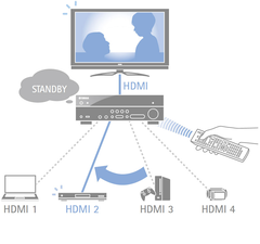 When the AV receiver is in HDMI Standby Through mode, the input source (Blu-ray™ Disc player, game console, etc.) for viewing on the monitor can be changed via the remote control. There’s no need to turn on the AV receiver in order to switch sources.