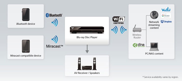 This Blu-ray Disc Player is compatible with Miracast™, a wireless standard that lets you connect any Miracast™-compatible smartphone or tablet for mirroring videos and photos to the player, so the whole family can view them on a widescreen TV. When using a Yamaha AV receiver, you'll enjoy a variety of media mirrored via Miracast™ with dynamic sound.