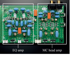 The phono amp is comprised of an MC head amp and an equaliser amp, each of which are discretely configured, resulting in a rich sound with pronounced musicality, when playing vinyl records with both MC and MM phone cartridges.
