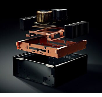 An independent three-dimensional inner frame has been employed in order to provide a more solid mount for the large toroidal transformer, which is installed in the centre of the A-S3000, considering the ideal weight balance. The completely copper-plated inner frame has a structure which integrates the front-back and left-right frames with a convex-shaped highly rigid main frame as its base, reducing vibration coming from all directions. For the base, to which the power transformer is installed on the inner frame, brass was selected by strictest examining the particular sonic properties of various materials by exhaustive listening tests. This material effectively reduces vibration caused by the power transformer, helping to create sound of greater clarity and spaciousness.