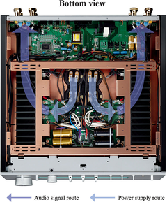 The amplifier circuit design features independent pre amp and power amp blocks, and perfect left-right symmetry. Separation of the pre amp, which handles low energy signals, from the power amp, which handles high-energy amplified signals, greatly reduces sound deterioration caused by mutual interference. Moreover, the left-right symmetrical design, which keeps the left and right power stages completely separate, ensures greater channel separation and enhances clarity of the stereo image.