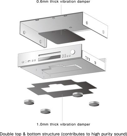 This unit has a double top and bottom structure with steel vibration dampers on both the top cover and the bottom of the chassis. Various vibrations that lower sound quality are prevented by joining the CD mechanism and chassis using our proprietary loader support, and by increasing the stiffness of the mechanism itself by anchoring it to the surface. The optical pickup is specialized for CD use with priority on sound quality, and an intelligent digital servo that performs servo control optimized for the disc being played achieves stable disc tracing and improves reading precision. The result is natural and high purity sound playback.