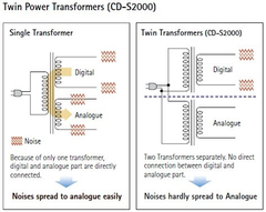 The independent power supplies use separate transformers to isolate the audio circuitry from the digital circuitry to eliminate any effect of noise from both circuits. The audio section employs a toroidal transformer that holds down magnetic flux leakage to achieve a stable power supply. Specialised windings on the left and right channels isolate the rated current circuits to the left and right beyond them, achieving superior separation characteristics.