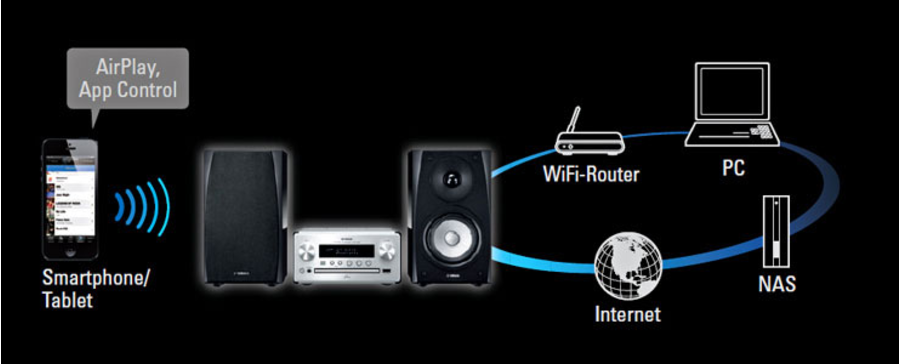 The MCR-N560 lets you connect the usual audio sources like CD, radio and USB, but also includes network functions to greatly expand your musical choices. You can link to a home network to listen to music from your PC or NAS, stream music from online sources, and enjoy thousands of radio stations via Internet Radio. You can also stream your own stored music from your smartphone or tablet.