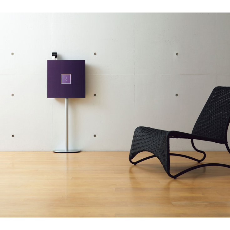 With a sleek stand and minimal proportions, Restio looks like a work of art.It was created by completely re-imagining the concept of a music source as part of the interior. The independent body style makes music an interior design element, and because the sides are slanted, it appears to be a thin panel. The front grille uses expanded metal, providing an attractive texture. The striped pattern printed underneath the grille conveys a feeling of depth, giving the impression that the music is coming from within the entire front surface. Merging beautifully into the living space, this is an entirely new audio form that you can match to your lifestyle.