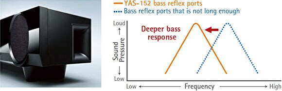 The YAS-152 employs a bass reflex port that has a straight shape and adequate length to provide outstanding bass response together with the large volume cabinet. The duct outlet is shaped like a trumpet bell, which reduces wind noise for better sound clarity.