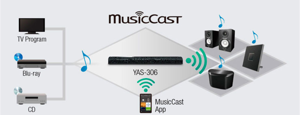 MusicCast employs a high performance wireless network to deliver music and audio enjoyment. It can stream digital music content from your smartphone, PC or NAS to other MusicCast devices in your home. It can also share the music from external devices such as a TV or Blu-ray player connected to the YAS-306. Audio content from Bluetooth-connected smartphones or tablets can also be streamed to MusicCast devices in multiple rooms.