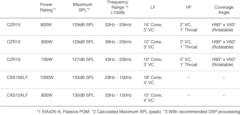 Perfectly suited for use with CZR full-range speakers, the CXS15XLF is a bass-reflex type subwoofer with extended low frequencies, outstanding clarity, and best-in-class 131dB SPL performance.