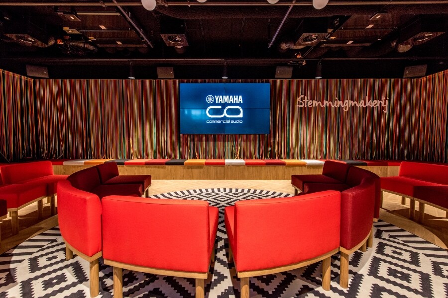In De Stemmingmakerij, a room for meetings and AV presentations, four Yamaha VXS8 full-range, surface-mount speakers are installed as a stereo system, arranged to seamlessly cover the room, which is wider than it is deep. Powered by an XMV4180 multi-channel amplifier and managed by an MTX3 matrix processor, when a microphone is used the two middle speakers are automatically lowered in volume, maximising gain before feedback.