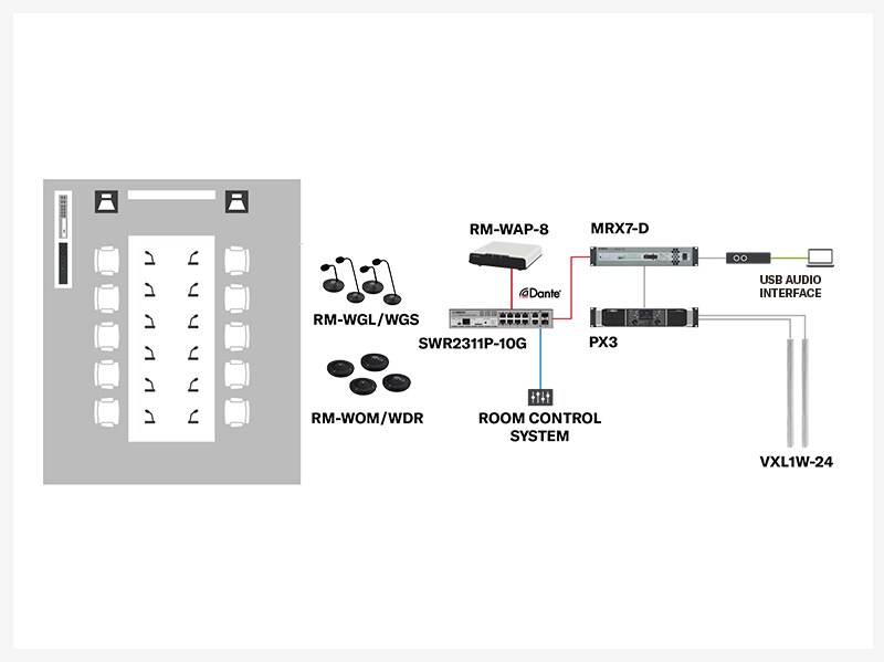 The RM-CR conference processor optimally matches all components to the room. VXL loudspeakers provide clear, transparent sound.