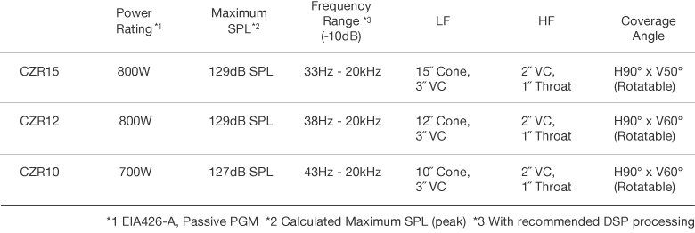 The CZR15 and CZR12 can both produce 129dB SPL with a power rating of 800W for the CZR15 and CZR12, and 700W for the CZR10 in passive mode. Every CZR model is also equipped with Biamp mode to maximize performance.
