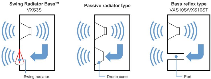 A number of methods are used to enhance low frequency response in speaker enclosures. In bass reflex designs, a tuned port in the enclosure boosts low frequencies emanating from the rear of the speaker unit. The VXS10S adopts this method, specializing in more powerful low frequency reproduction. The problem with this approach is that as the enclosure becomes smaller or thinner, the size of the port must be reduced accordingly, resulting in increased resistance and correspondingly reduced bass enhancement. Bass reflex designs are not always suitable for compact enclosures.