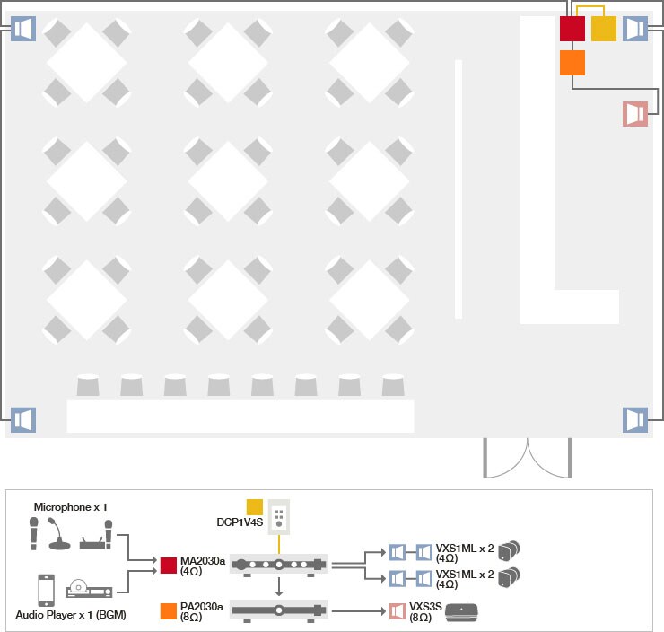 This is a system that connected VXS3S with high impedance and constructed multiple satellites. You can easily change the required volume by switching the output W number by tapping. The MA2120 can deliver different sources at different volumes in the respective zone.