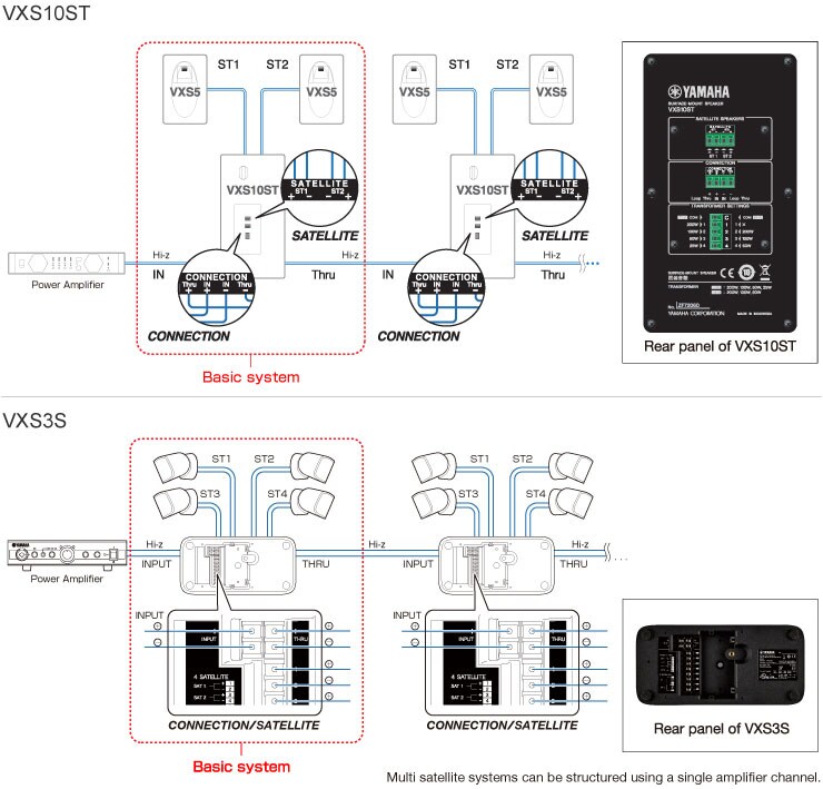 The VXS3S and VXS10S/VXS10ST have satellite connectors on the rear panel, minimizing the number of amplifier channels required to get a system up and running. And since the VXS3S and VXS10ST support high-impedance connections, it is possible to connect low-impedance satellites while the subwoofer is connected to a high-impedance system, for example. A built-in high-pass filter is automatically applied to the satellite speakers, providing exceptionally smooth, natural frequency crossover from subwoofer to satellites.