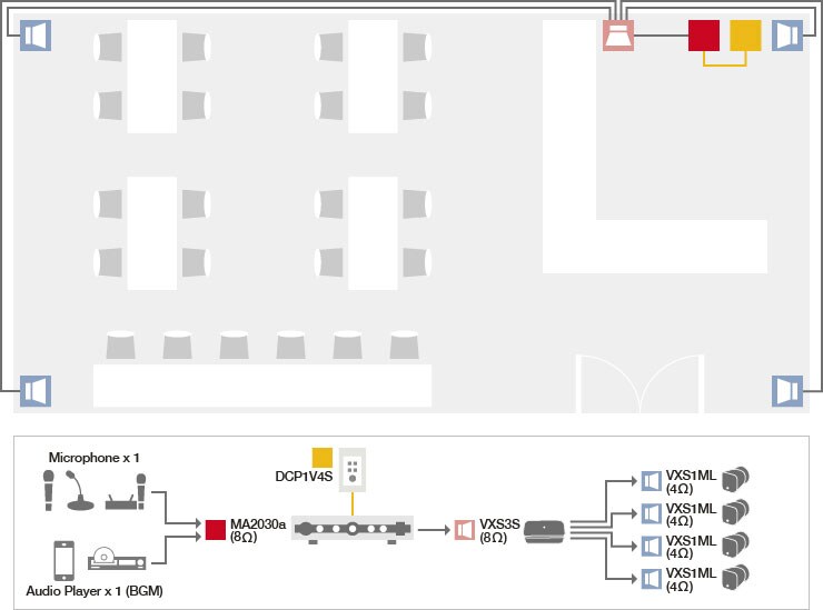 The VXS1ML and VXS3S system is ideal for BGM application such as cafe where just a few speakers will be used to cover the service area. Wide dispersion allows effective coverage with a minimum number of speakers. It can be installed easily and quickly with satellite connection.