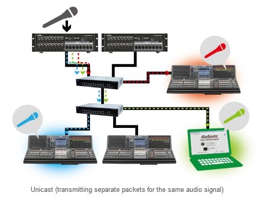 In unicast, packets (audio signals) are duplicated for each device that the signal is sent to. You can set the routing for each of the signals separately without considering whether the signals are duplicates of each other. From the standpoint of efficient use of network bandwidth, unicast might not be ideal, but because it results in low switch loads and makes routing configuration easier, we recommend that you use it under normal circumstances.