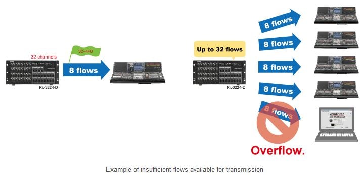 There are limits to the number of flows that can be assigned to a transmitter or receiver. For example, CL/QL Series consoles and R Series I/O racks can all send and receive 32 flows. For the Rio3224-D, which has 32 analog inputs, to send all 32 channels to a single Dante device, 32/4 = 8 flows are sufficient. However, using unicast flows to send the channels to 4 devices (CL/QL series consoles, for example) requires the use of all 8 × 4 = 32 flows.