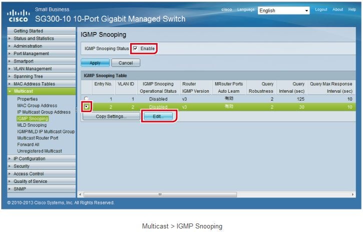 Next, in the following page, select the “Enable” check box next to IGMP Snooping Status, and click “Apply”. To edit the IGMP snooping settings, select the VLAN ID for the network within which multicast will be used (in this example, we are assuming that VLAN 2 is for Dante), and click “Edit”.