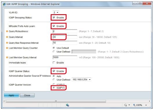 Select the “Enable” check boxes next to IGMP Snooping Status, MRouter Ports Auto Learn, and IGMP Querier Status. Also, we recommend that you set Query Interval to “30” (seconds) and set IGMP Querier Version to “IGMP V3”. When the query interval is large, the time required before multicast starts working properly becomes longer. Dante supports both IGMP V2 and V3, but all switches in the network should be running the same version. So if the network includes switches which support only IGMP V2, be sure to select "IGMP V2" as the IGMP querier version.