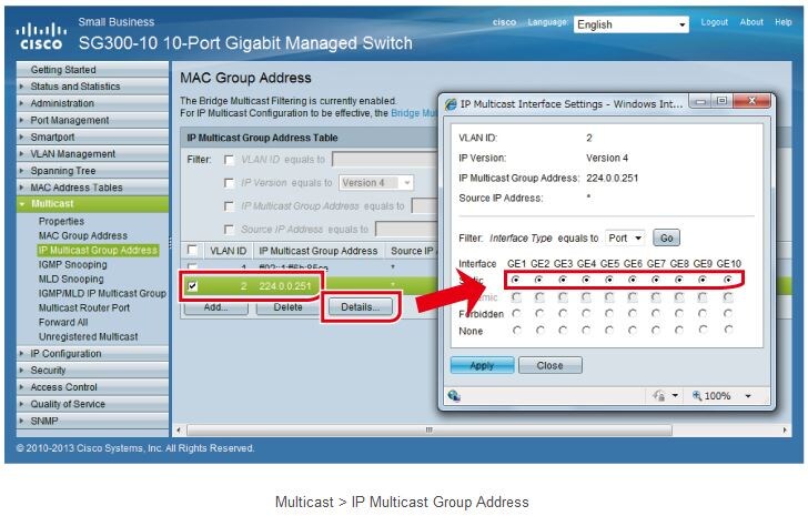 Finally, assign the registered multicast address to the corresponding ports. Select the multicast address that you registered, and click “Details” to open a dialog box. Set the corresponding ports to “Static” (including trunk ports), and click “Apply”.