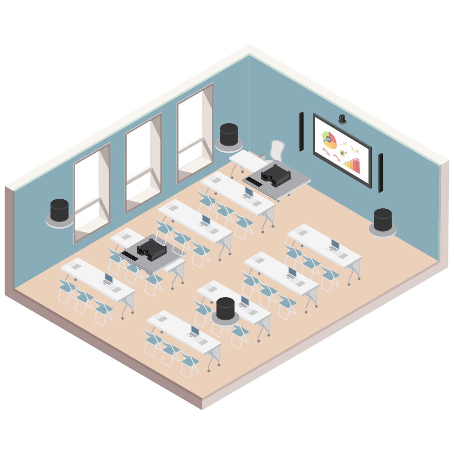 When you are using a large room (up to 150m²) Yamaha's advanced digital signal processing technologies can ensure a comfortable audio experience for everyone in attendance, providing consistent microphone and speaker performance regardless of where attendees are listening or speaking from within the space. Multiple RM-CG Ceiling Array Microphones quickly and reliably detect speakers in the room and can capture their voices authentically. Using the MRX-7D processor, the Microphones can be used for voice reinforcement, and everything can be easily controlled from a tablet interface using the ProVisionaire software.