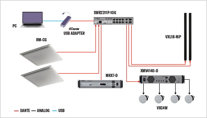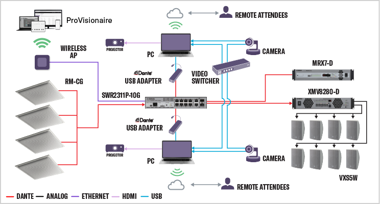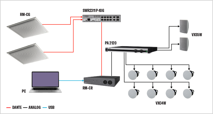 Larger Conferencing rooms can be covered using an ADECIA Ceiling Solution consisting of several RM-CG microphones, an RM-CR conference processor and VXL1-16P speakers. This solution can be used for transparent sound reproduction both for those in the room, and those on the other side of a remote call. This system is suitable for large-scale conference rooms. Advanced digital signal processing technologies ensure a comfortable audio experience for everyone in attendance, providing consistent microphone and speaker performance regardless of where attendees are listening or speaking from.