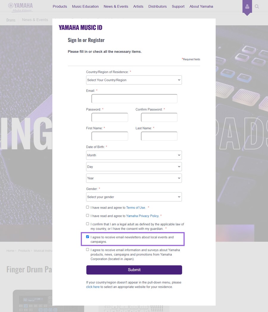 4. you have already registered on Yamaha Music ID, please ensure that “Email newsletters about local events and campaigns” is checked in the “Email News and Other Services” section of My Page (Refer to the image below).