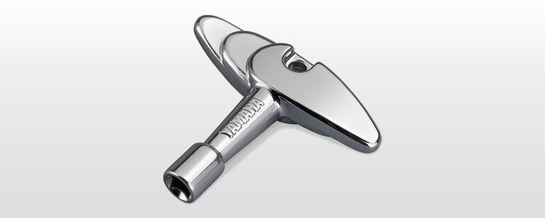 - A standard tuning key that is thicker at both ends of the handle so that it fits easily in the hand for smoother tuning.
