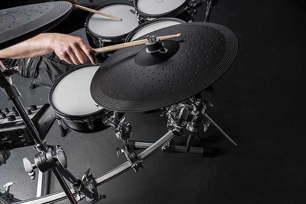 All cymbal pads feature playing 3-zones, meaning they all produce different sounds at the edge, bow, and cup, as well as choke and mute functionality. The 17” ride cymbal comes equipped with a hit point detection function.