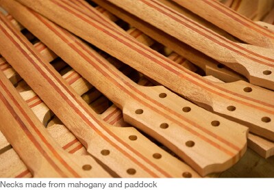 Fabricable, light, solid and firm fiber wood is apt for the neck material of the guitar. The guitar neck with two red stripes shown in the photograph use padoauk, red brick color wood, to improve strength of the mahogany wood. Finger board is easily worn out parts so that high density and durable wood as ebony is used. The ebony is the adequate wood for bridge too.