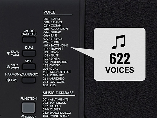 The PSR-E373 features a newly developed tone generator LSI that delivers stunning improvements in sound quality as well as high-quality effects. Thanks to this new LSI, you can enjoy a comprehensive library of 622 instrument Voices perfect for playing in any genre you choose, as well as unique Super Articulation Lite Voices that reproduce the trills and string noise of stringed instruments such as the cello and mandolin—previously difficult to emulate—with amazing realism, for superbly authentic performances.